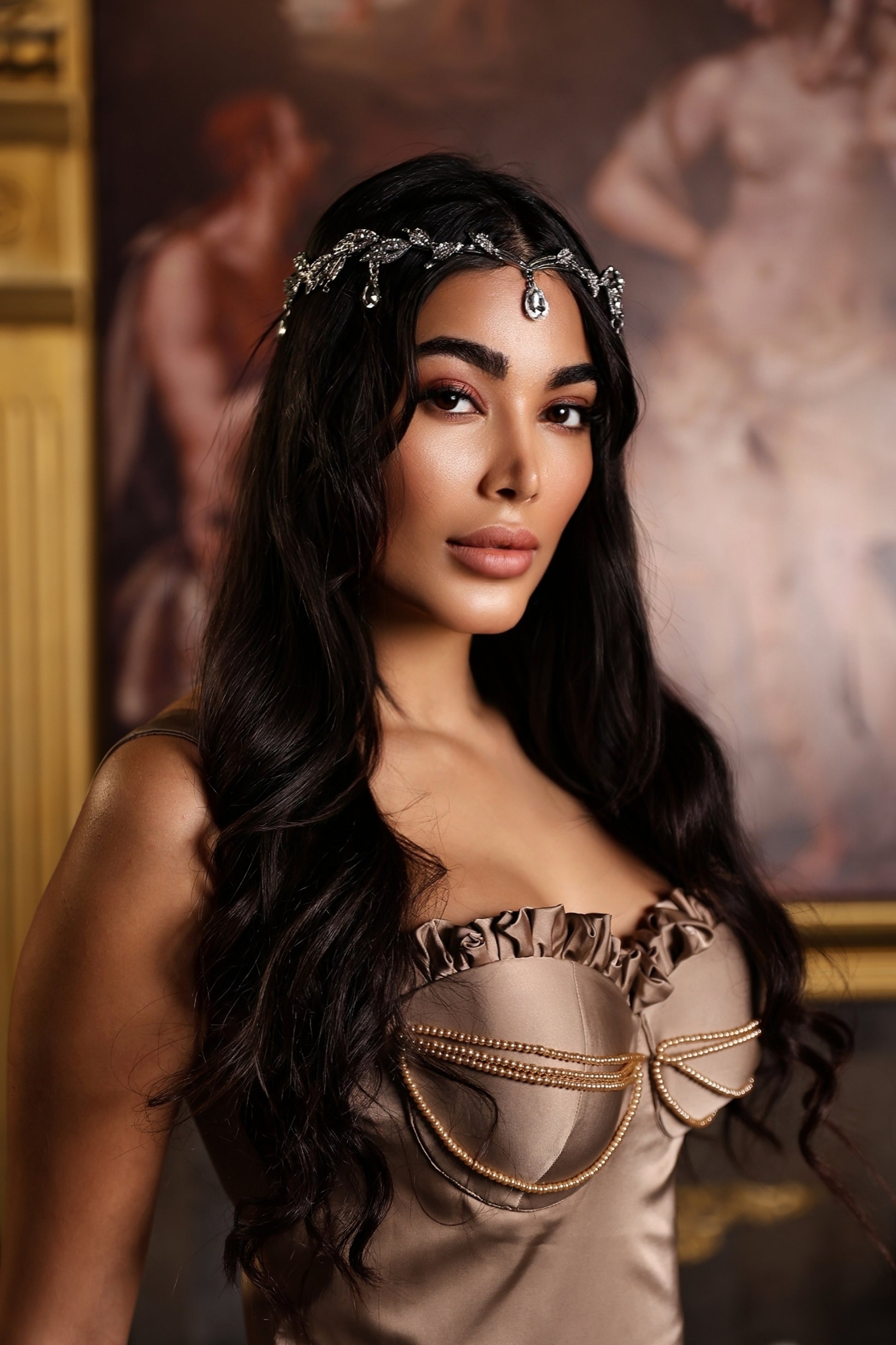 ✨ Golden Mermaid Dress by LEYDI Fashion Dubai ✨ A shimmering golden beige silk dream with a thigh-high slit, separate pearl-detailed cups, and that perfect mermaid silhouette. Shine like gold, glow like a queen. 🌟
