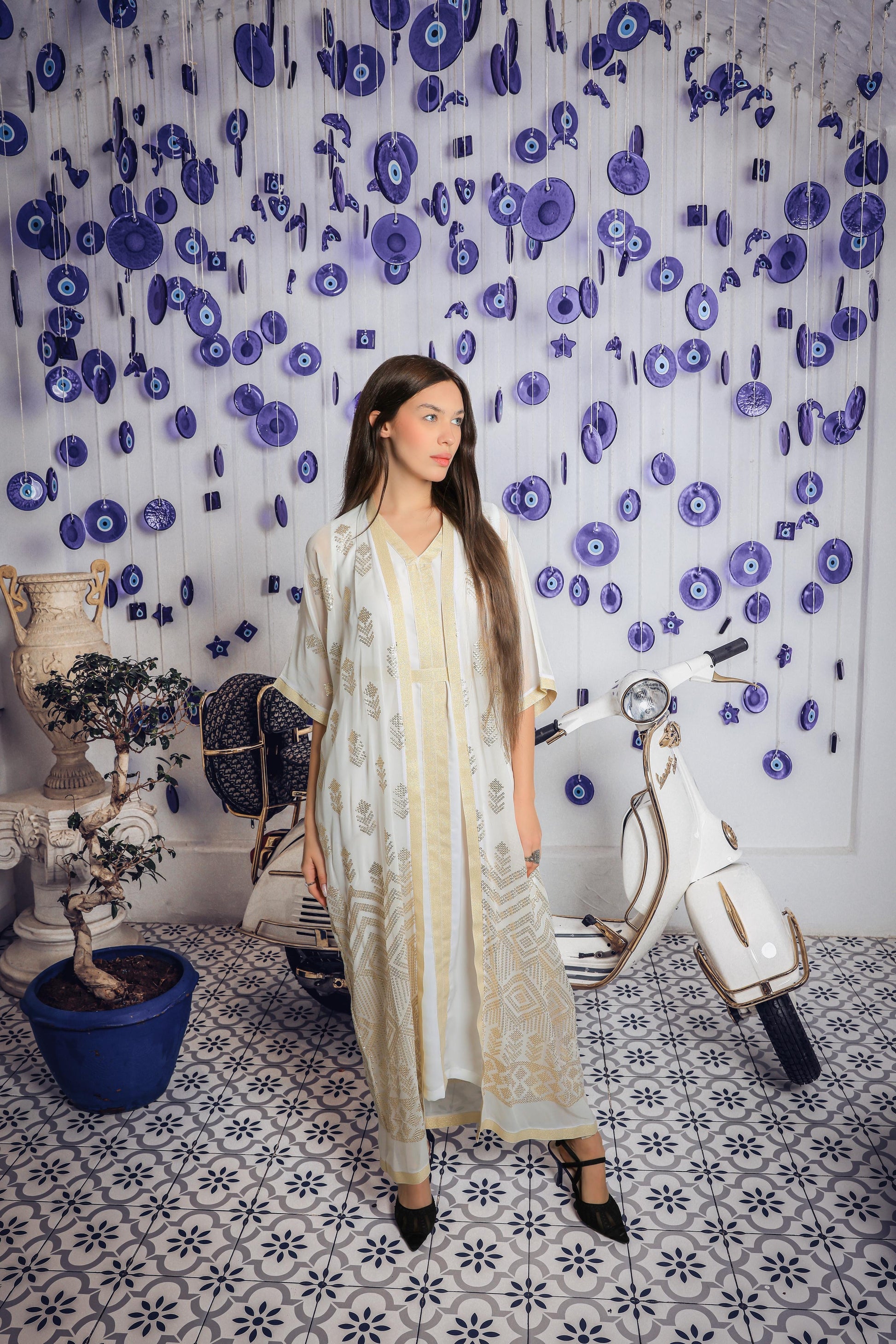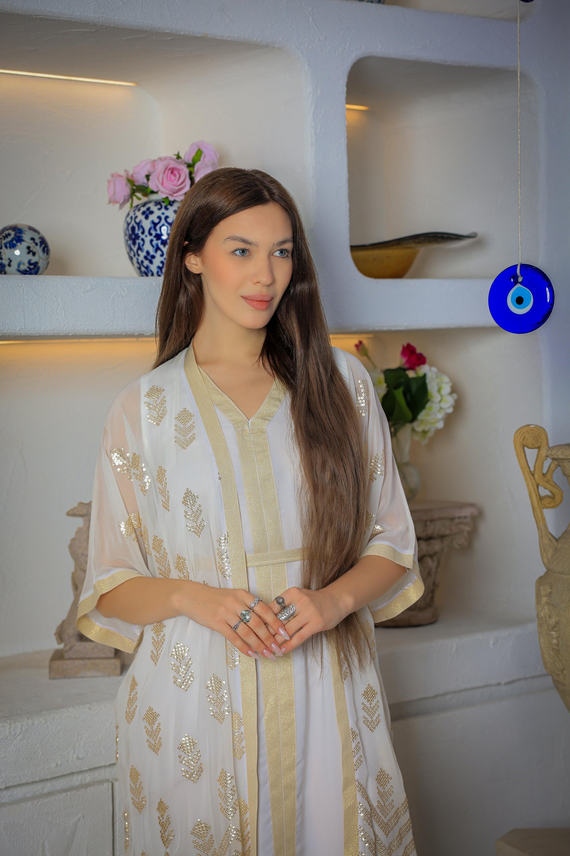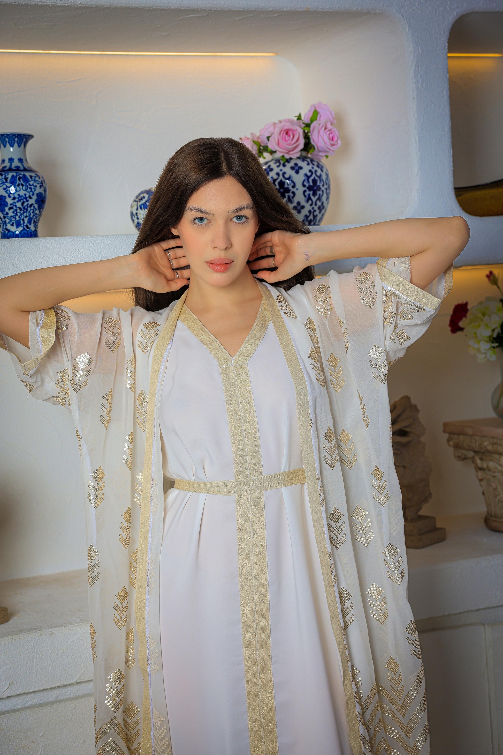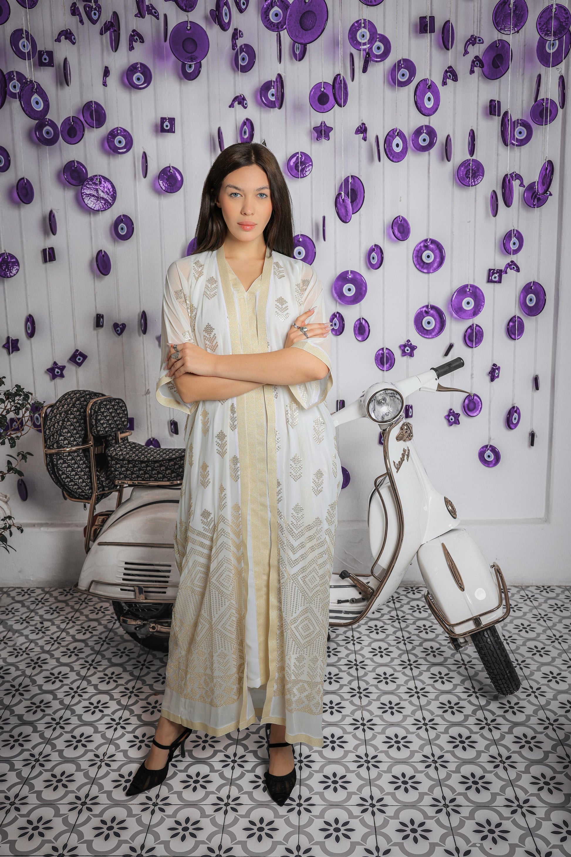 Experience elegance with “Malikat Al Noor” – a luxurious creamy chiffon dress adorned with subtle golden embroidery and delicate detailing. Designed for those who appreciate grace, refinement, and timeless beauty, this piece embodies the essence of modern Arabian fashion.