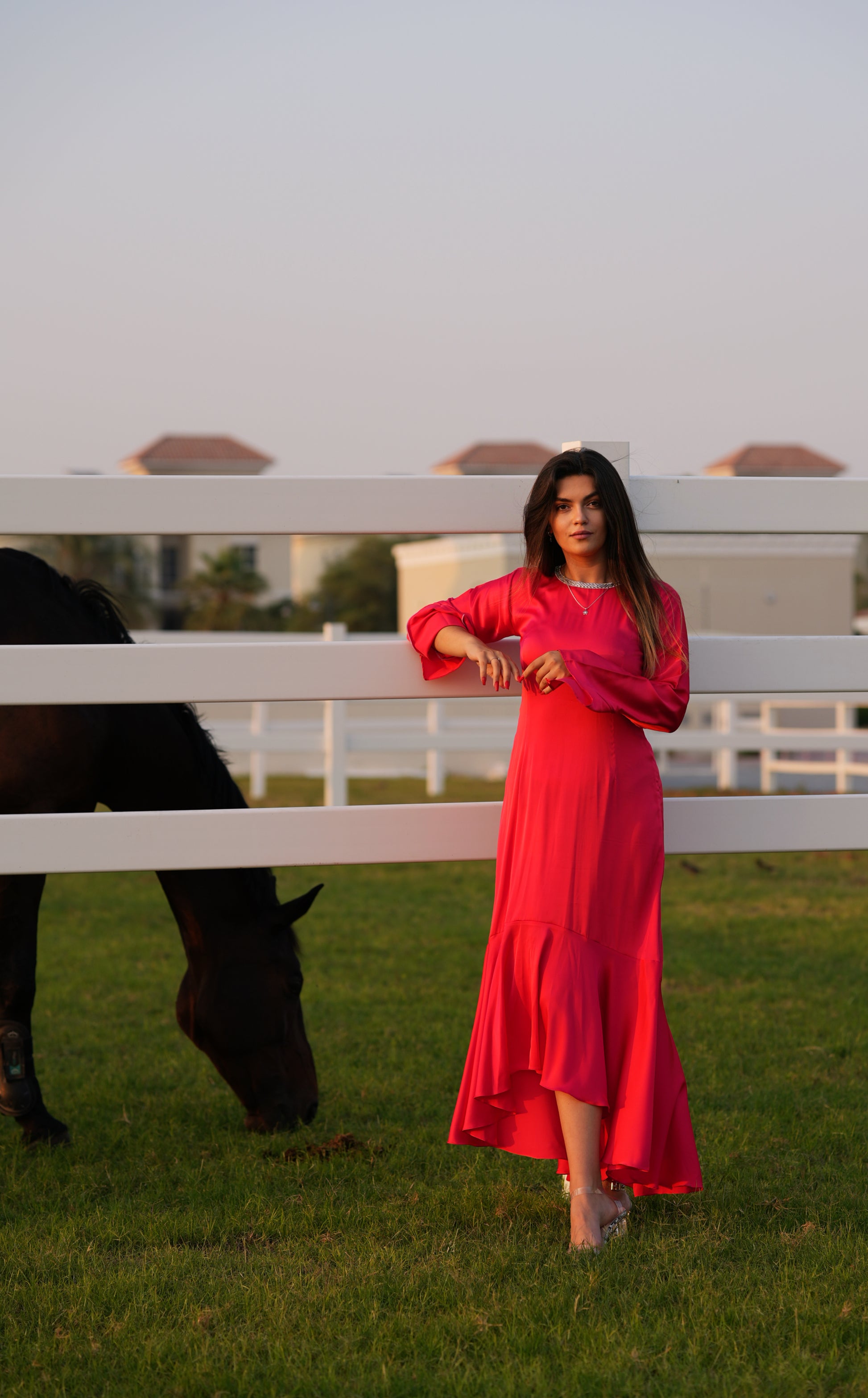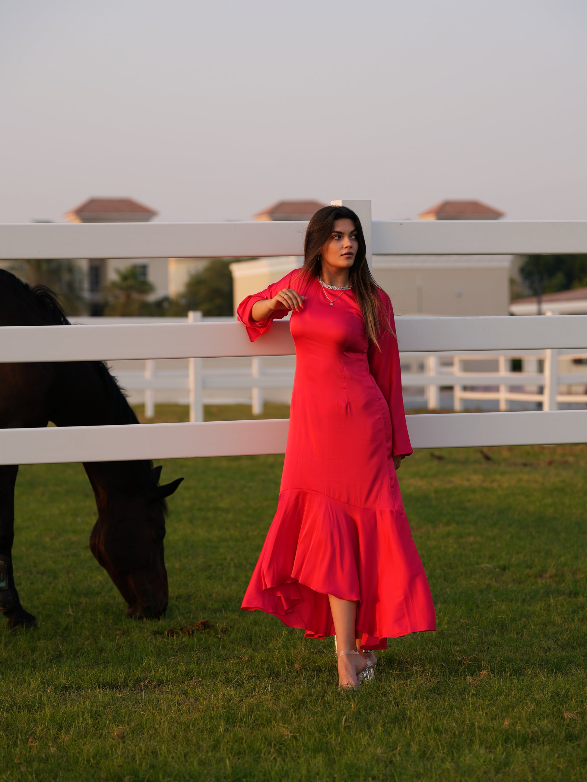 Raspberry Pink Silk Dress with mermaid tail cut and shiny stone neckline.